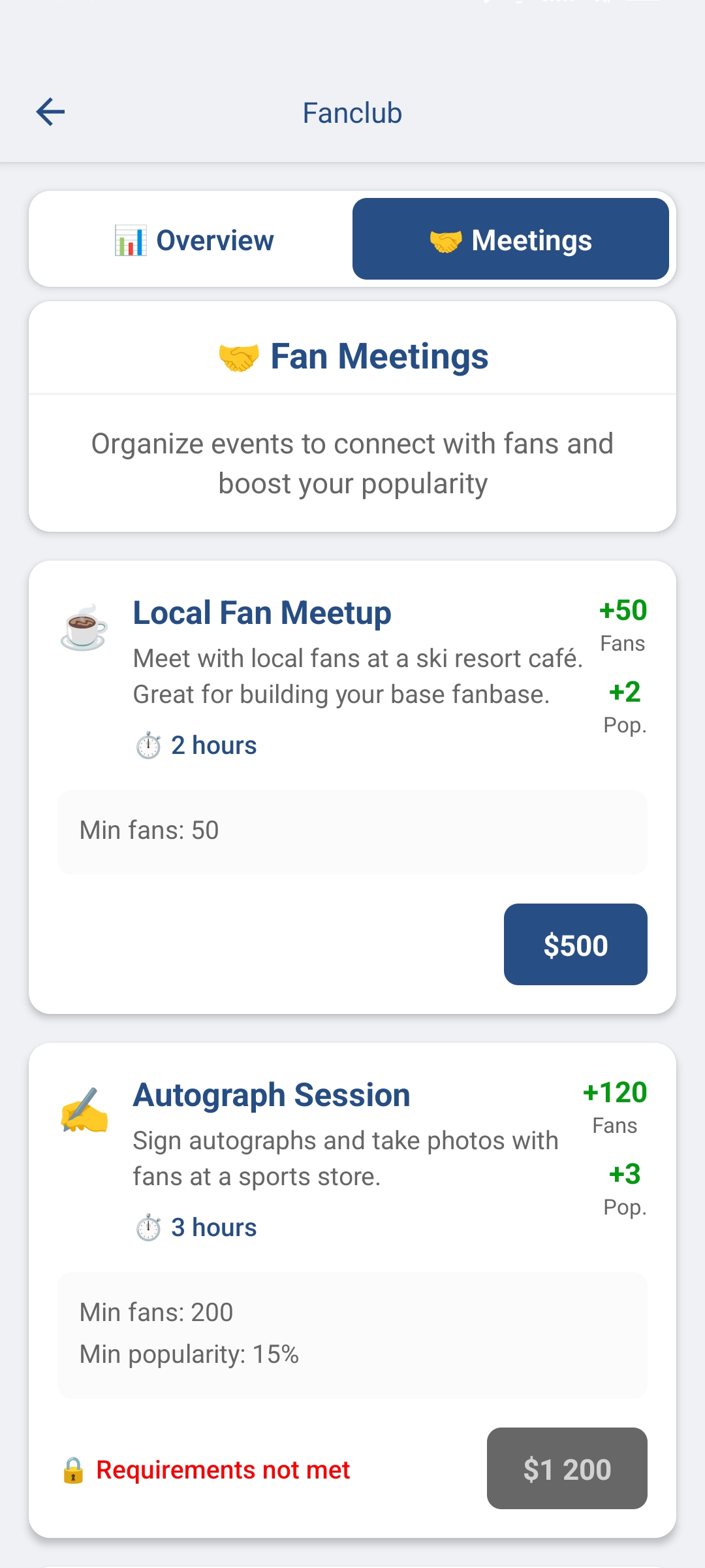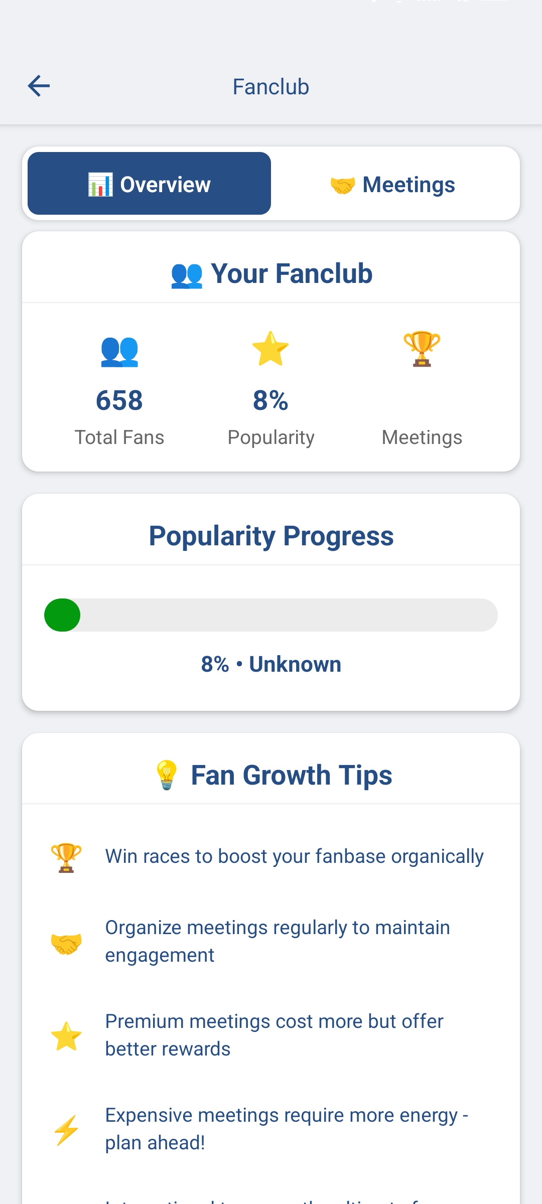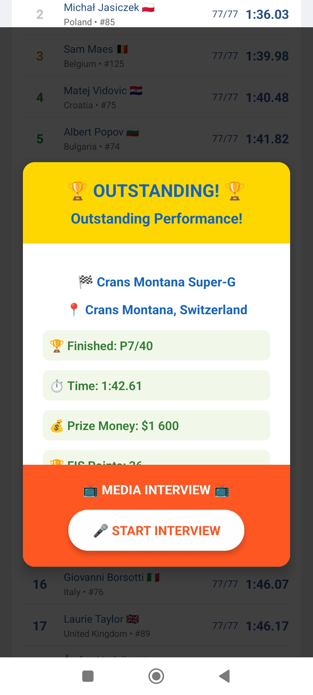 After a quality performance in races, journalists will be interested in you. Handle answering their questions as best as possible and increase your mood level and skills. A well-handled interview will also increase your fan count.