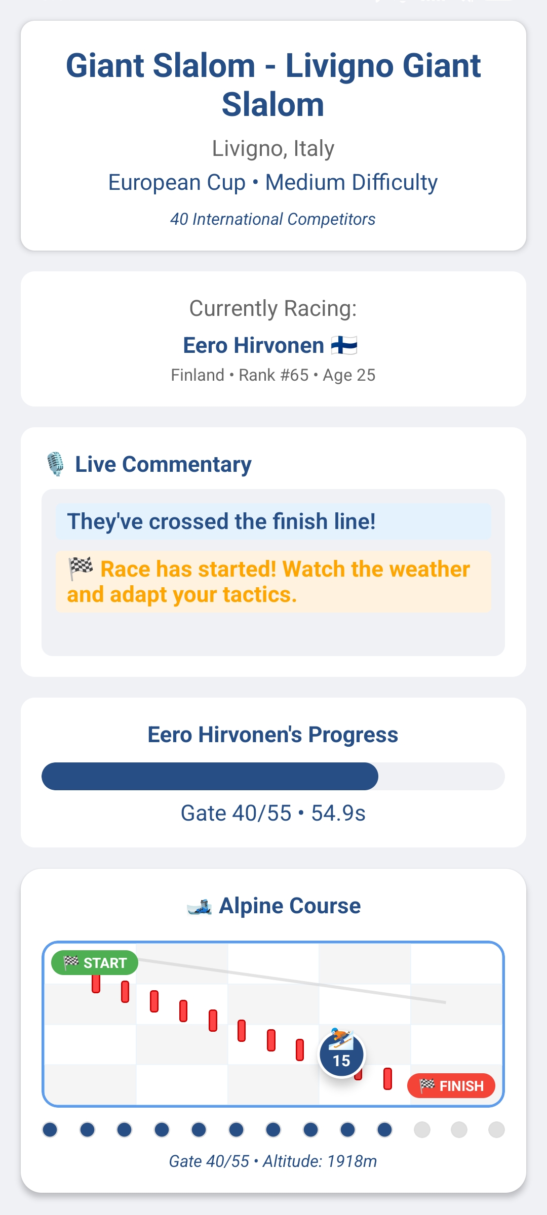 Ski races depend not only on the skier's quality but also on weather and track conditions. Monitor weather, choose racing tactics before races and adapt them in the middle of the track according to current conditions. This way you can reverse unfavorable development directly during your athlete's run.
